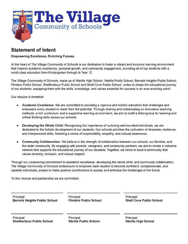 Shell Cove Public School is a proud member of The Village Community of Schools. We, along with our five partner schools, are united in the shared vision of providing exceptional educational experiences for our students.